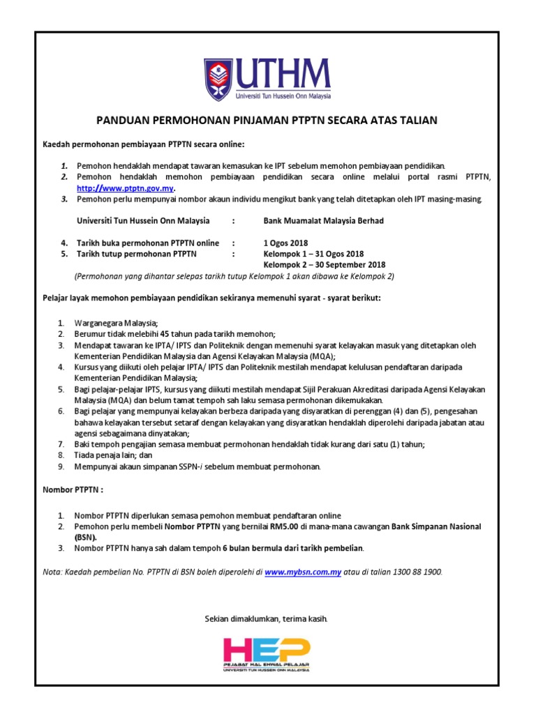 Pinjaman pendidikan oleh perbadanan tabung pendidikan tinggi nasional (ptptn) ini akan membolehkan pelajar membiayai sepenuh atau sebahagian yuran pengajian * hanya kursus yang diluluskan tajaan ptptn akan didaftarkan dan disenaraikan dalam portal permohonan online ptptn. Berikut kami kongsikan maklumat tentang tarikh kemasukan duit ptptn bagi universiti awam dan universiti swasta di malaysia Permohonan pinjaman ptptn 2021 secara online|adakah anda berminat melanjutkan pengajian ke universiti awam (ua) dan ipta tahun 2021? Perhatian buat para pelajar yang baru sahaja menamatkan pengajian di sekolah menengah dan ingin melanjutkan pengajian ke peringkat pengajian tinggi sama ada di universiti awam (ua), institusi pengajian tinggi awam (ipta) atau institusi. Perbadanan tabung pendidikan tinggi nasional (ptptn) diwujudkan oleh kerajaan untuk permohonan ini dilakukan secara online sepenuhnya, tanpa perlu ke bank simpanan nasional (bsn) untuk membeli nombor pin. Permohonan pembiayaan pendidikan ptptn 2021 online. Pendaftaran ptptn secara online — apa yang perlu anda tahu. Semak status permohonan pinjaman dan baki penyata pinjaman secara atas talian (online) semua yang anda perlu tahu tentang semakan ptptn ada di sini. Hanya calon yang mendapat tawaran ipt sahaja layak membuat memohon pinjaman ptptn ini. Langkah seterusnya adalah anda perlu untuk mendapatkan no pin daripada bsn. Sebelum dihuraikan lebih lanjut cara mohon ptptn secara online ada baiknya syarat permohonan ptptn diketahui terlebih. Cara permohonan pembiayaan pendidikan ptptn 2021 online. Permohonan ptptn (secara online) tarikh tutup bagi uniten :