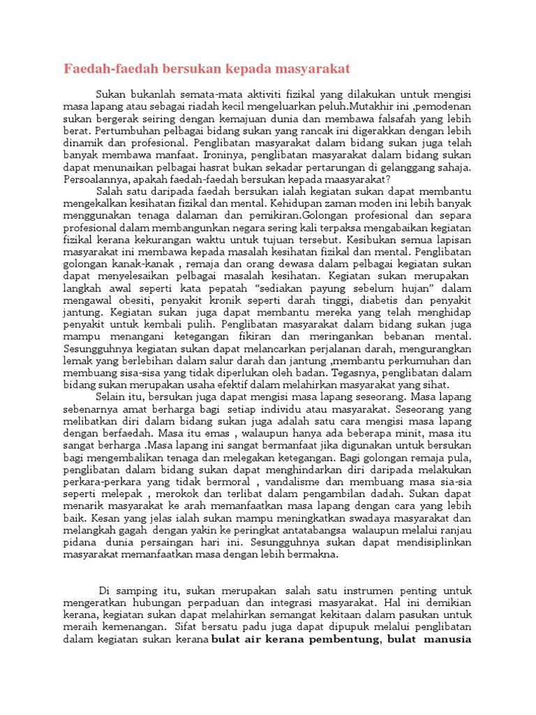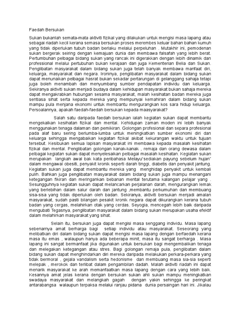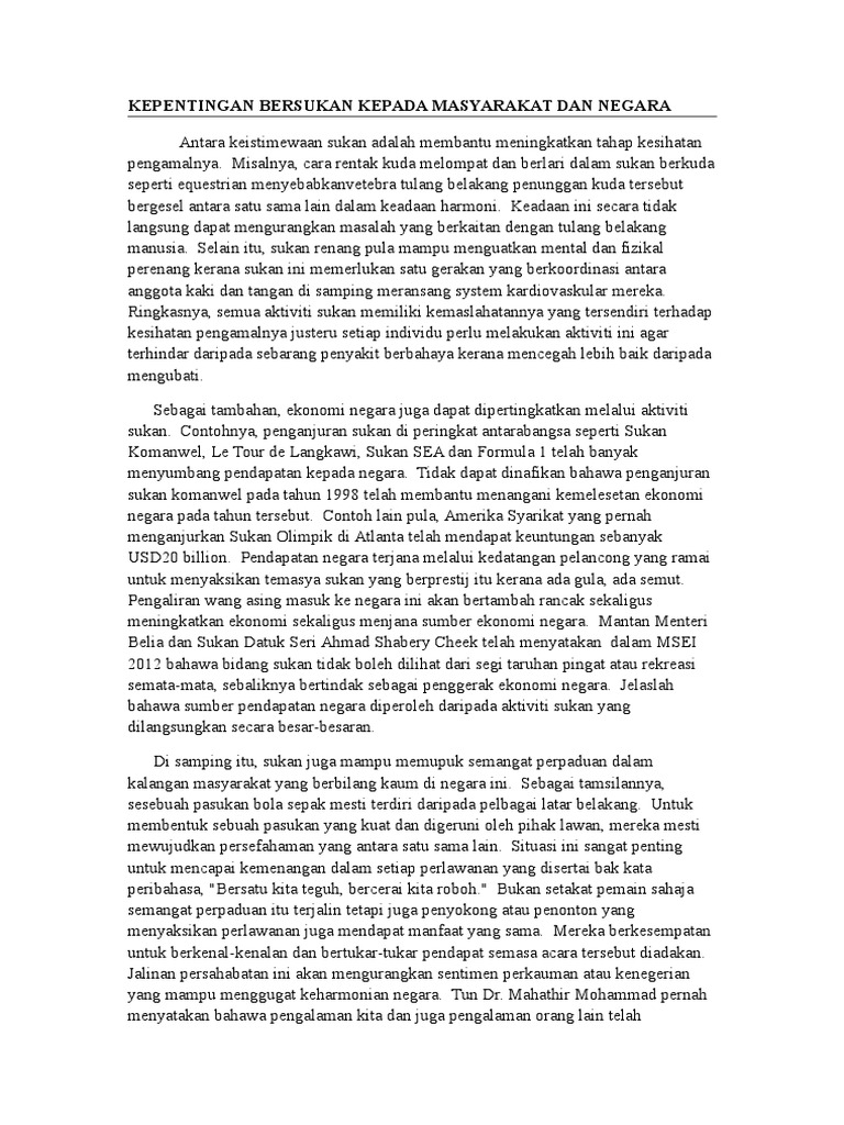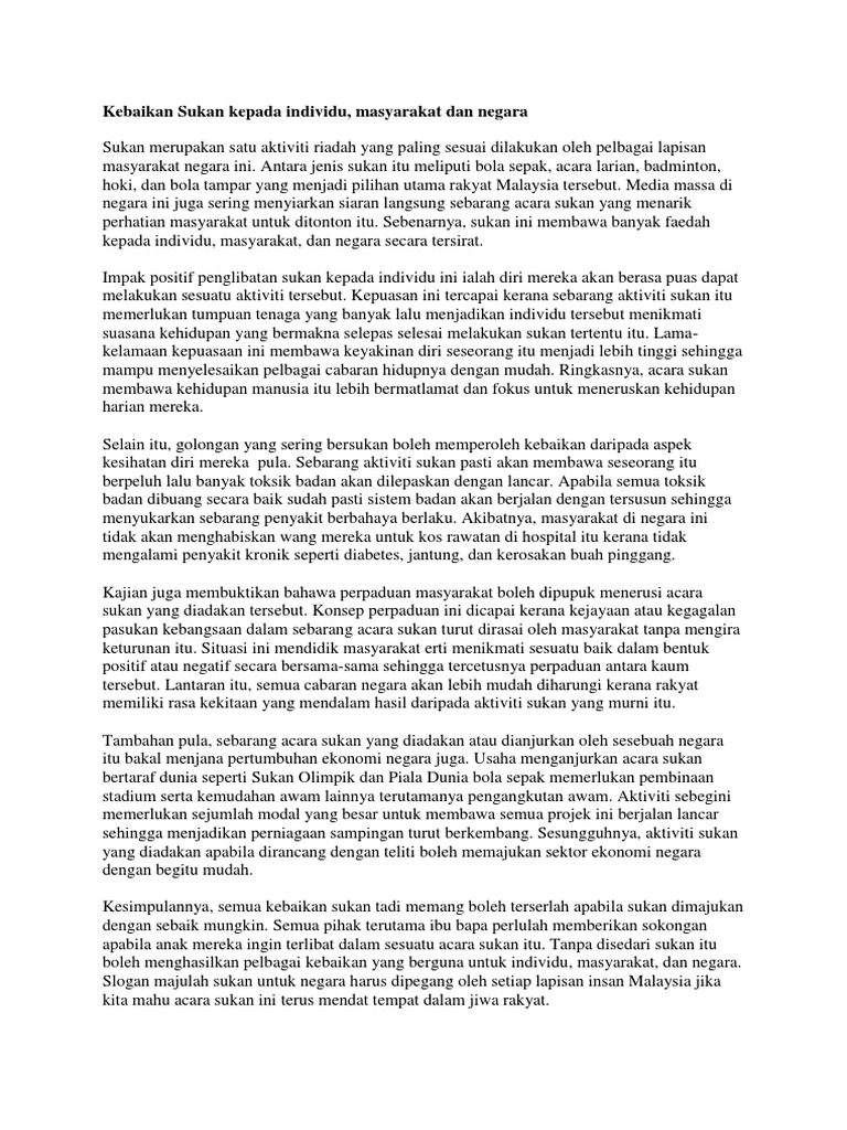Masa lapang yang tidak diisi dengan perkara yang berfaedah akan menyebabkan pelajar membazirkan. Impak positif penglibatan sukan kepada individu ini ialah diri mereka akan berasa puas dapat melakukan sesuatu aktiviti tersebut. Misalnya, melalui kejohanan perlumbaan kereta formula 1 di litar sepang, sukan komanwel 1998, kita dapat mempopularkan negara kita dalam kalangan peminat sukan dunia. Contoh karangan kebaikan dan kepentingan aktiviti sukan kepada masyarakat dan negara. Ramai yang tak tahu kebaikan sukan di sekolah, pelajar mesti baca. Pelbagai pihak terutama masyarakat telah mula jemu dengan pelbagai alasan yang. Misalnya, cara rentak kuda melompat dan berlari dalam sukan berkuda seperti equestrian menyebabkanvetebra tulang belakang penunggan kuda tersebut bergesel antara satu sama lain dalam keadaan harmoni. Tanpa disedari sukan itu boleh menghasilkan pelbagai kebaikan yang berguna untuk individu, masyarakat, dan negara. Menjadikan tubuh badan sihat dan minda cerdas. Perkara 152 perlembagaan dan akta bahasa kebangsaan 1963/67 memperuntukkan bahasa melayu sebagai. Dalam pembentangan bajet 2019, kerajaan bercadang mengenakan levi pelepasan bagi semua penumpang udara ke luar negara, iaitu rm20 ke. Dbp tidak bersetuju dengan keputusan kementerian belia dan sukan menukar nama hari sukan negara 2019 seperti yang diumumkan timbalan menterinya, steven sim chee keong. Dapat membentuk disiplin dan sahsiah terpuji.