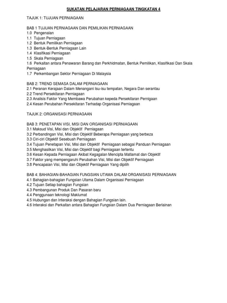 Blog mata pelajaran mpei perniagaan spm (3766): 2 prakata sukatan pelajaran pengajian perniagaan yang baharu ini digubal untuk menggantikan sukatan pelajaran pengajian perniagaan sedia ada yang telah digunakan semenjak peperiksaan sijil tinggi persekolahan malaysia pada tahun 1999. Pembuatan keputusan perniagaan dan persekitarannya pengeluaran pemasaran kewangan sumber manusia penggal ketiga c: Majlis peperiksaan malaysia kandungan sukatan pelajaran 946 pengajian perniagaan halaman matlamat 1 objektif 1 kandungan 2−24 bentuk peperiksaan 25 senarai rujukan 25−26 soalan contoh: 3 sukatan pelajaran baharu ini digubal untuk menggantikan sukatan pelajaran sedia ada yang telah digunakan pada tahun sukatan pelajaran yang baharu ini akan mula digunakan pada tahun 2012.